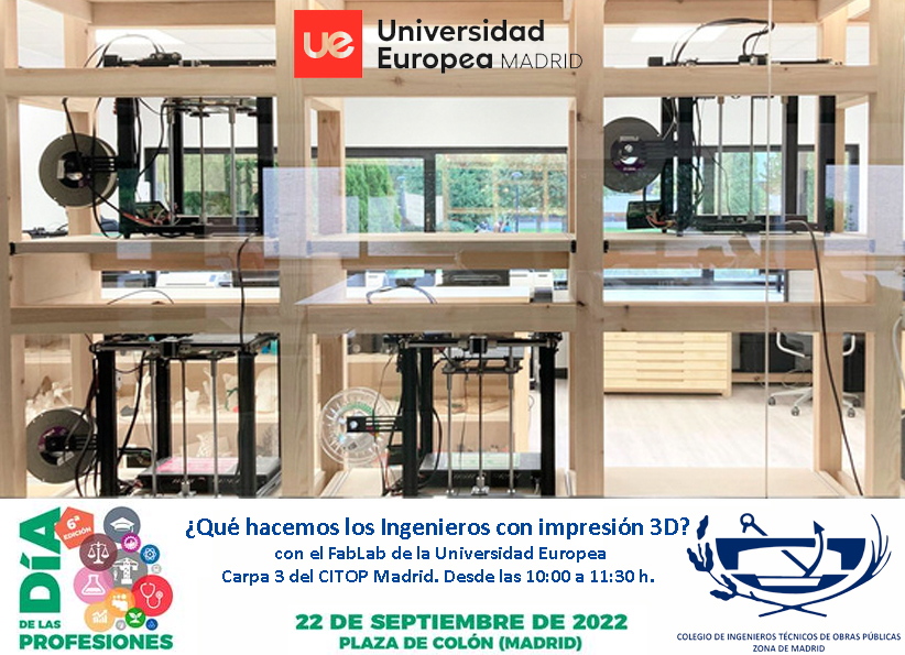 Entre las 10 y las 12 h., desarrollaremos un taller sobre impresión 3D en Ingeniería Civil de la mano de los expertos del FabLab de la Universidad Europea. La máquina estará trabajando mientras el responsable del FabLab va explicando el funcionamiento de la misma para diseñar y elaborar distintos elementos constructivos y los múltiples usos que se están desarrollando en el ámbito de las Obra Civil.